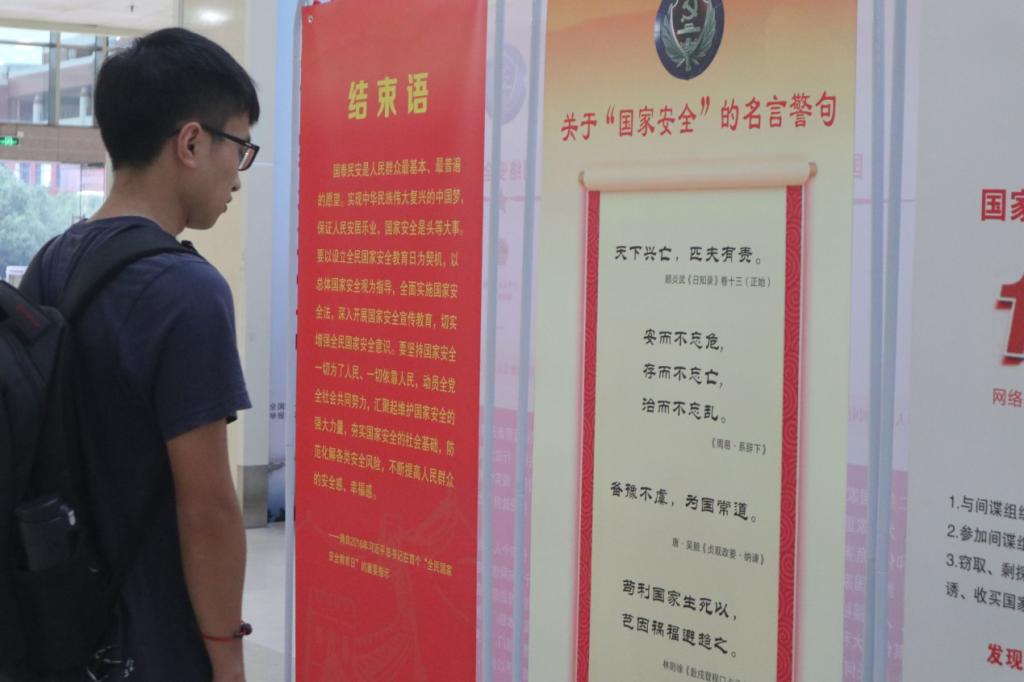 2019年4月18日下午17:40分,文学系学生党支部第18期发展对象在文学系学生党支部指导老师谢树萍老师、文学系学生党支部副书记黄群珍同志以及各支委组织带领下,于中央图书馆一楼参观了全民国家安全教育日系列宣传教育展览。本次展览主题为“坚持总体国家安全观,着力防范化解重大风险,喜迎中华人民共和国建国70周年”。