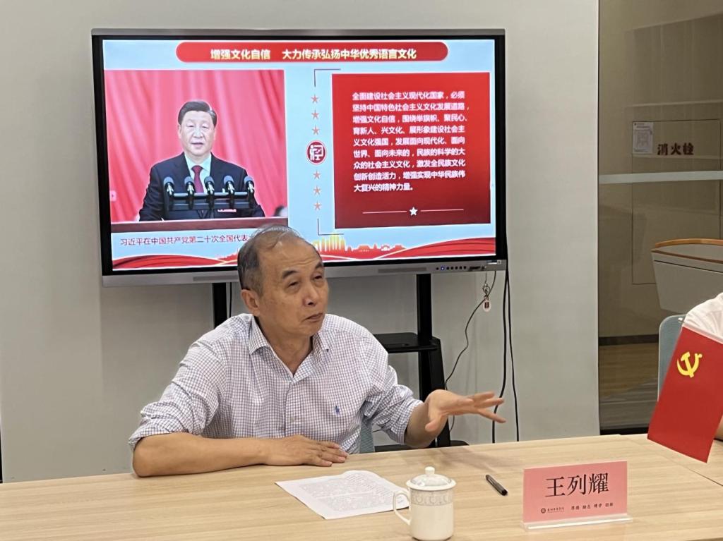 王列耀副校长结合党课内容强调:各位党员要深入学习贯彻党的二十大精神,深刻领悟“两个确立”的决定性意义,增强“四个意识”、坚定“四个自信”、做到“两个维护”,立足语言文字是国家重要的文化资源、经济资源、安全资源、战略资源这一战略定位,深刻认识语言文字事业基础性、全局性、社会性、全民性的内涵特征,加大国家通用语言文字推广力度,传承弘扬中华优秀语言文化,以语言文字事业高质量发展全面服务支撑中国式现代化,为全面建设社会主义现代化国家、全面推进中华民族伟大复兴贡献力量。