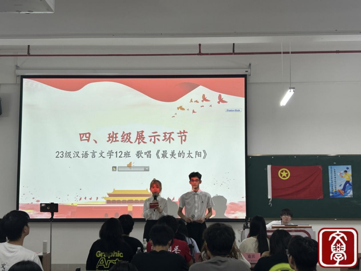 大会第四项议程,班级展示环节。欣赏由23级汉语言文学12班的同学所带来的歌曲《最美的太阳》。激昂的旋律与饱满的热情感染了全场,展现了新时代青年昂扬向上的精神风貌。