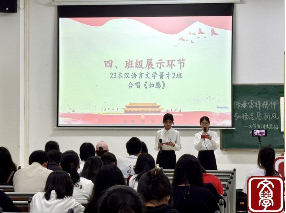第四项议程由23级汉语言文学菁才2班的同学带来班级展示,献唱歌曲《如愿》。歌声悠扬动人,“而我将爱你所爱的人间,愿你所愿的笑颜……”伴随着屏幕上播放的中国阅兵、航母护海等画面,展现了祖国的强盛景象。回望百年前的屈辱历史,先辈们用鲜血浇灌,才挽大厦之将倾,缔造新中国。百年奋斗,今日中国繁荣昌盛,但我们仍需不忘初心,砥砺前行,为中华民族伟大复兴不懈努力。