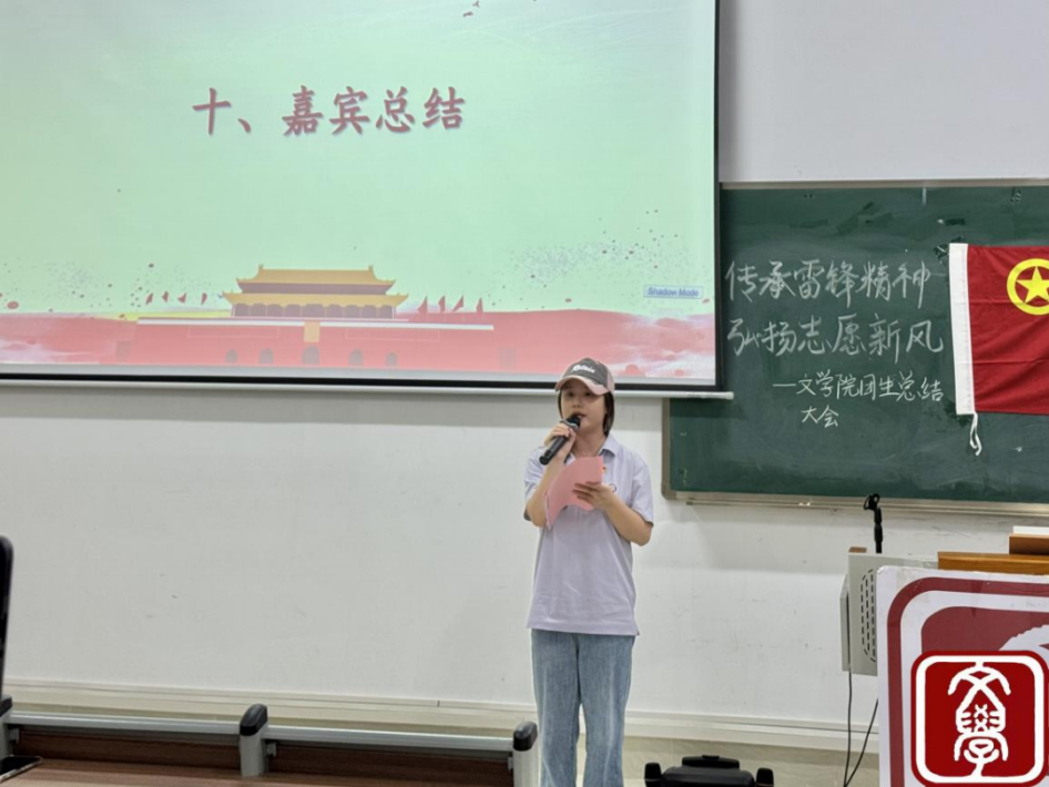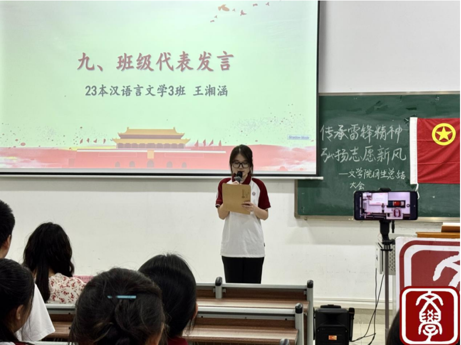 随后,23级汉语言文学3班王湘涵同学发言。她总结本月团生活动为“一次思想洗礼与心灵触动”,分享了自己的感悟,并剖析雷锋精神的内涵:热爱党、热爱祖国、热爱社会主义的崇高理想与坚定信念;服务人民、助人为乐的奉献精神;“干一行爱一行,钻一行精一行”的敬业精神;锐意进取、自强不息的创新精神;以及艰苦奋斗、勤俭节约的创业精神。她呼吁同学们弘扬新时代雷锋精神,争做传承者。