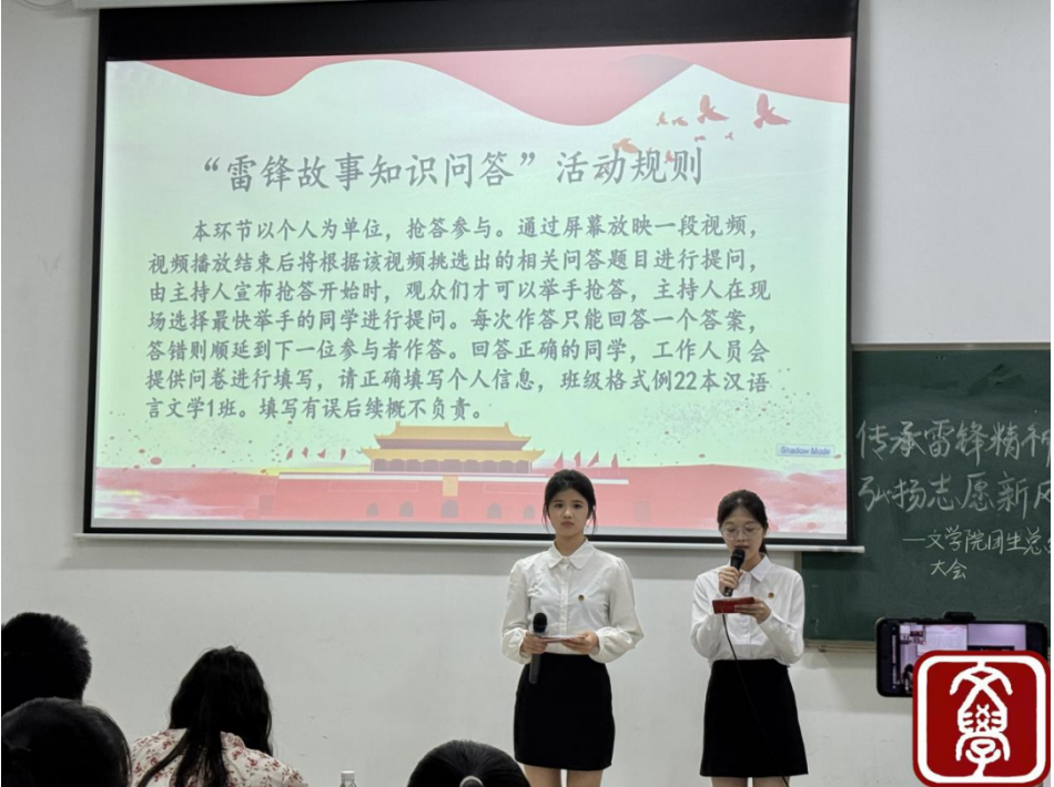 第六项议程是快问快答互动环节。通过播放雷锋精神相关视频并开展知识竞赛,同学们加深了对雷锋的认识,更好地将雷锋精神融入生活。