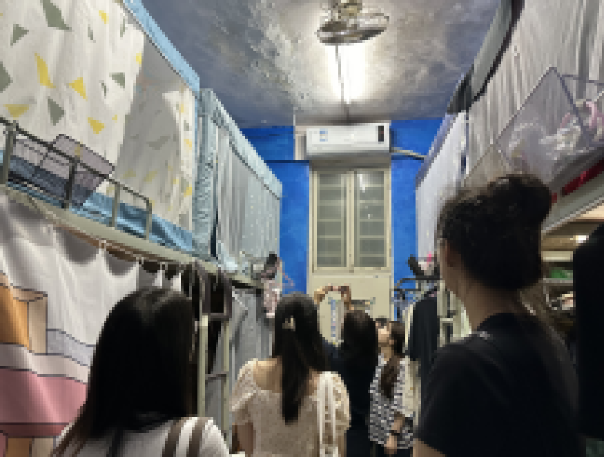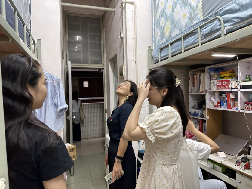 在走访宿舍的过程中,吕书勉主任一行人细致地查看了宿舍环境,与学生们亲切交谈,关心询问他们的学习、生活状况以及在宿舍生活中遇到的困难。从宿舍的布置到同学之间的关系,从日常作息到学习规划,每一处细节都牵挂着老师们的心。吕主任鼓励同学们营造良好的宿舍氛围,培养团队协作精神,将宿舍打造成温暖、积极、向上的生活与学习空间,为“一站式社区”的发展奠定坚实基础。
