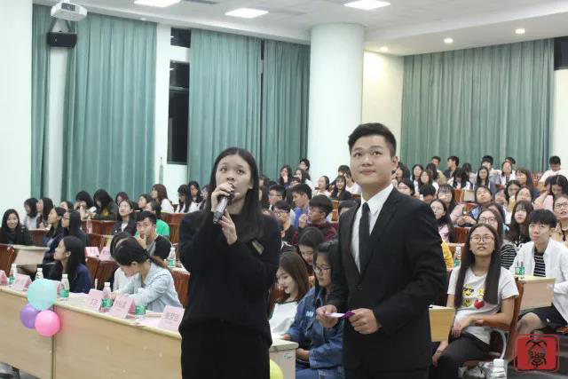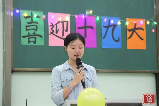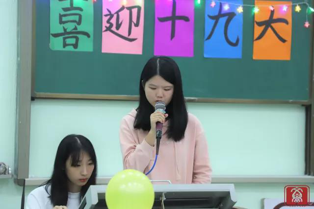 大会伊始,全体师生奏唱中国共青团团歌。随后,大会进入了下一环节:各班团生活动视频的展示。一帧帧影像尽是各班同学为响应十九大而开展的团生活动。在精彩的视频过后,16汉文1班和17广告1班的代表分别进行班级团生展示。两个班的班级代表通过播放视频和PPT展示的方式分别对自己班级的议题进行清晰的介绍,解说并发表了意见。在团生展示之后是主办方为这次总结大会量身定制的互动环节:改良版的“击鼓传花”。以音乐代鼓声,以气球替花,而惩罚是音乐停止后接住气球的人要用方言读出有关十九大会议的内容。