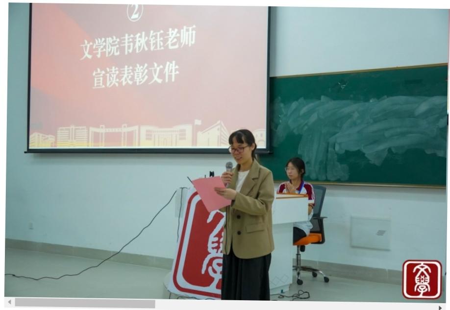 随后,大会迎来最激动人心的第三项议程——颁奖仪式。首先揭晓的是“优秀班会”奖项,24级汉语言文学7班、23级汉语言文学2班、24级汉语言文学4班凭借出色表现脱颖而出。三位班级代表步伐稳健地走上领奖台,从侯英杰老师手中接过荣誉证书,并在镜头前定格下这一荣耀时刻。