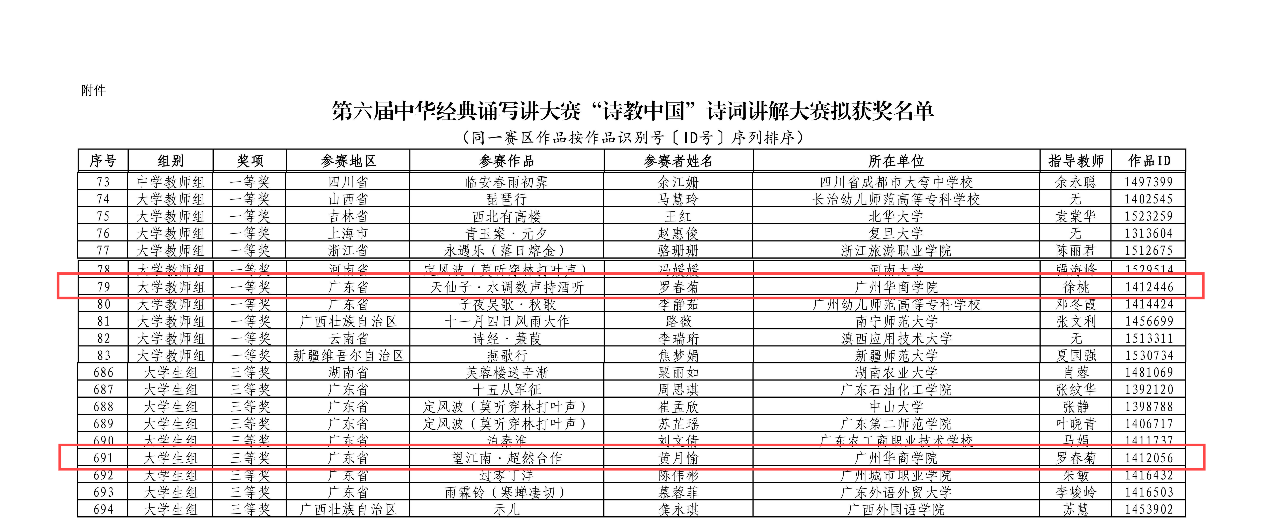 近日,由教育部、国家语委主办的第六届中华经典诵写讲大赛“诗教中国”诗词讲解大赛公布获奖名单,威廉希尔教师罗春菊在徐桃副院长的指导下参赛,并以其讲解作品《天仙子•水调数声持酒听》获全国大学教师组一等奖、由罗春菊老师指导的22级汉语言文学13班的黄月愉同学讲解作品《望江南•超然台作》获全国大学生组三等奖,实现威廉希尔在该赛事国家级奖项的突破。