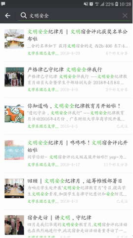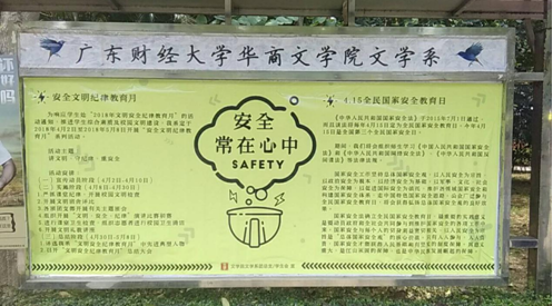 通过一网两微(文学系官网、微博、微信公众号)的网络辐射以及文学系各班群的宣传,并且在文学系宣传栏张贴海报和在各班召开主题班会。让文学系全体师生及时获取关于本次文明安全教育纪律月的内容并且广泛开展相关教育教学工作。
