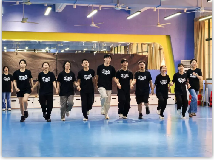 第一个热身练习,詹老师组织同学们分为两组,围绕凳子开展热身活动。两组同学步伐轻快,专注地绕凳行进,完成一圈后,同组成员默契击掌,现场气氛活跃。