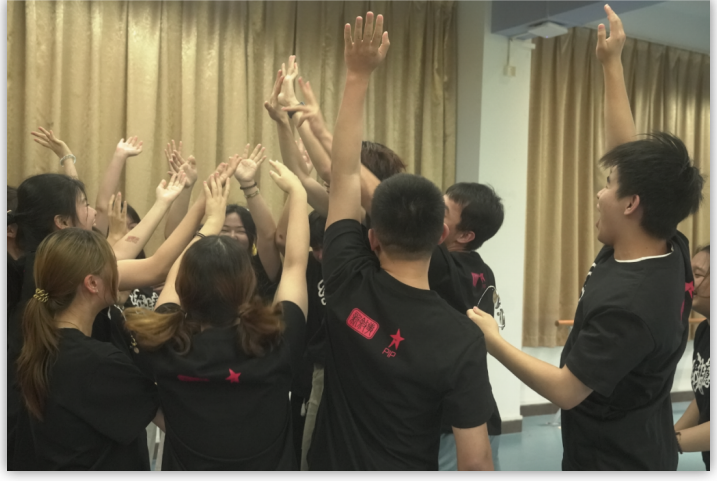 第二个练习以步伐为主题,由詹老师亲自示范,带领同学们先由两人协同,再到十人成组做同样的动作,要求实现动作统一。同学们经过磨合,逐步调整,最后整齐步伐在课室行走。